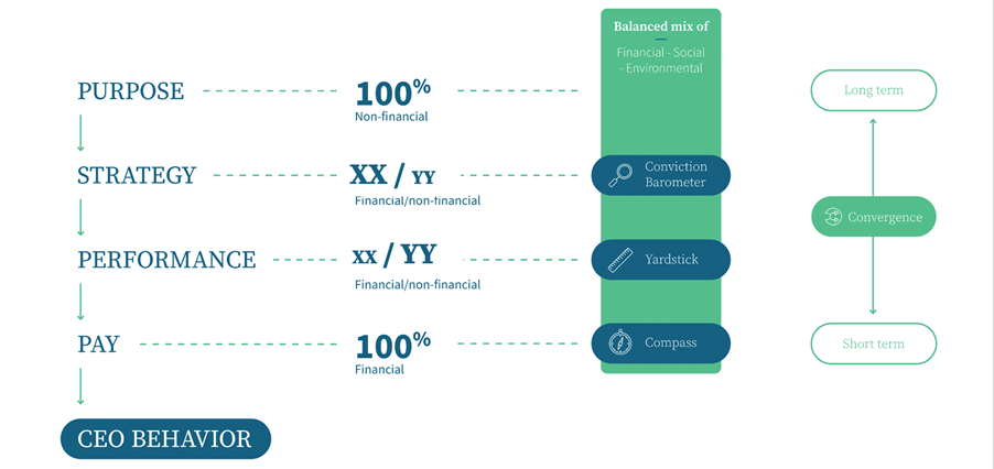 FB: As I mentioned, corporate purpose statements are mainly long-term oriented, while executive pay is much more short-term oriented. This misalignment needs to be addressed for several reasons. First of all, intrinsically well-motivated leaders should not be hindered by incentives that take their attention away from long-term sustainable value creation. It is key that extrinsic motivation through incentives is enforcing leaders to execute in accordance with their intrinsic motivation to do good. Secondly, incentive agreements are a contract between managers and their company, whereby shareholders are to vote on the remuneration policy. This means that a remuneration plan mainly focused on short-term financial performance also tells you something about the shareholder view on long-term sustainable value creation.