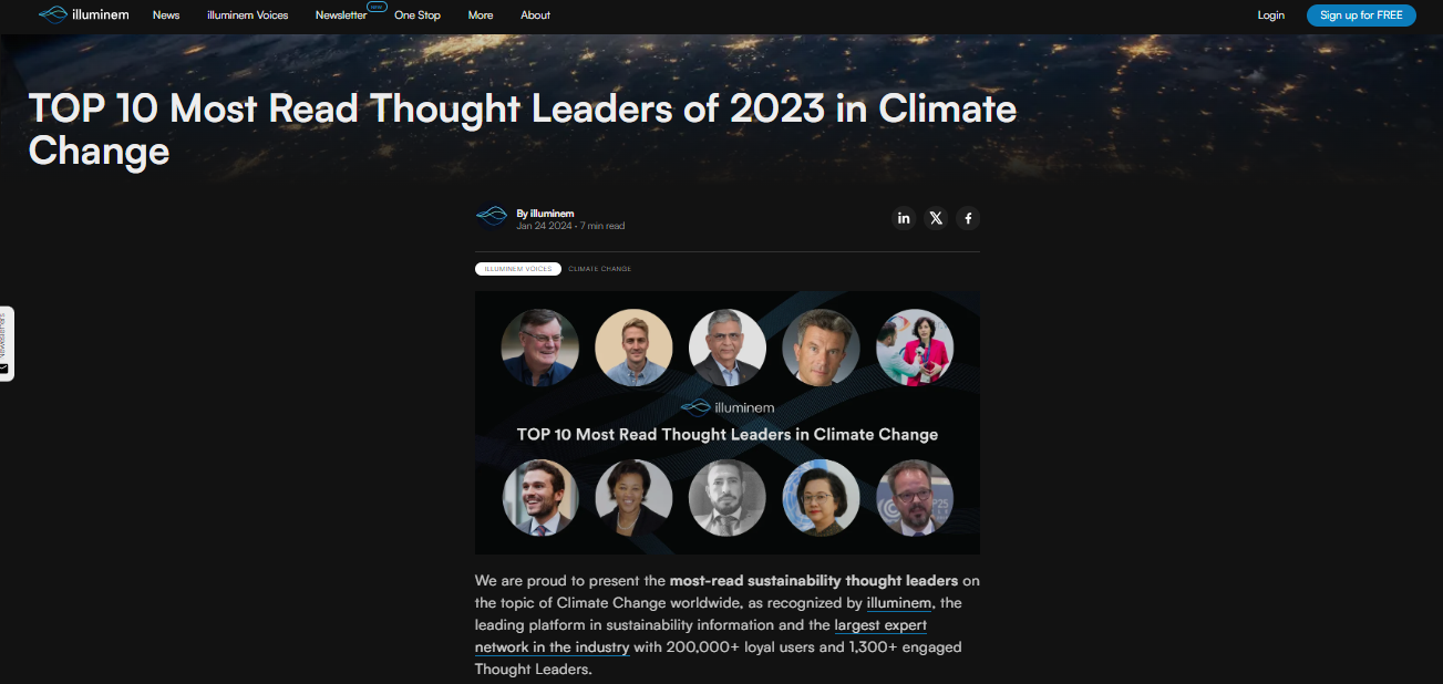 Honoured to find a place in illuminem’s “Top 10 Most Read Thought Leaders of 2023 in Climate Change”.