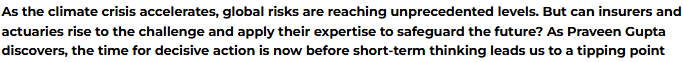 What next? After this spot-on diagnosis by IFoA, would insurers choose to follow their prescription? Or would they merrily continue in a #BAU mode? Thereby leaving behind a legacy of aiding and abetting climate breakdown?